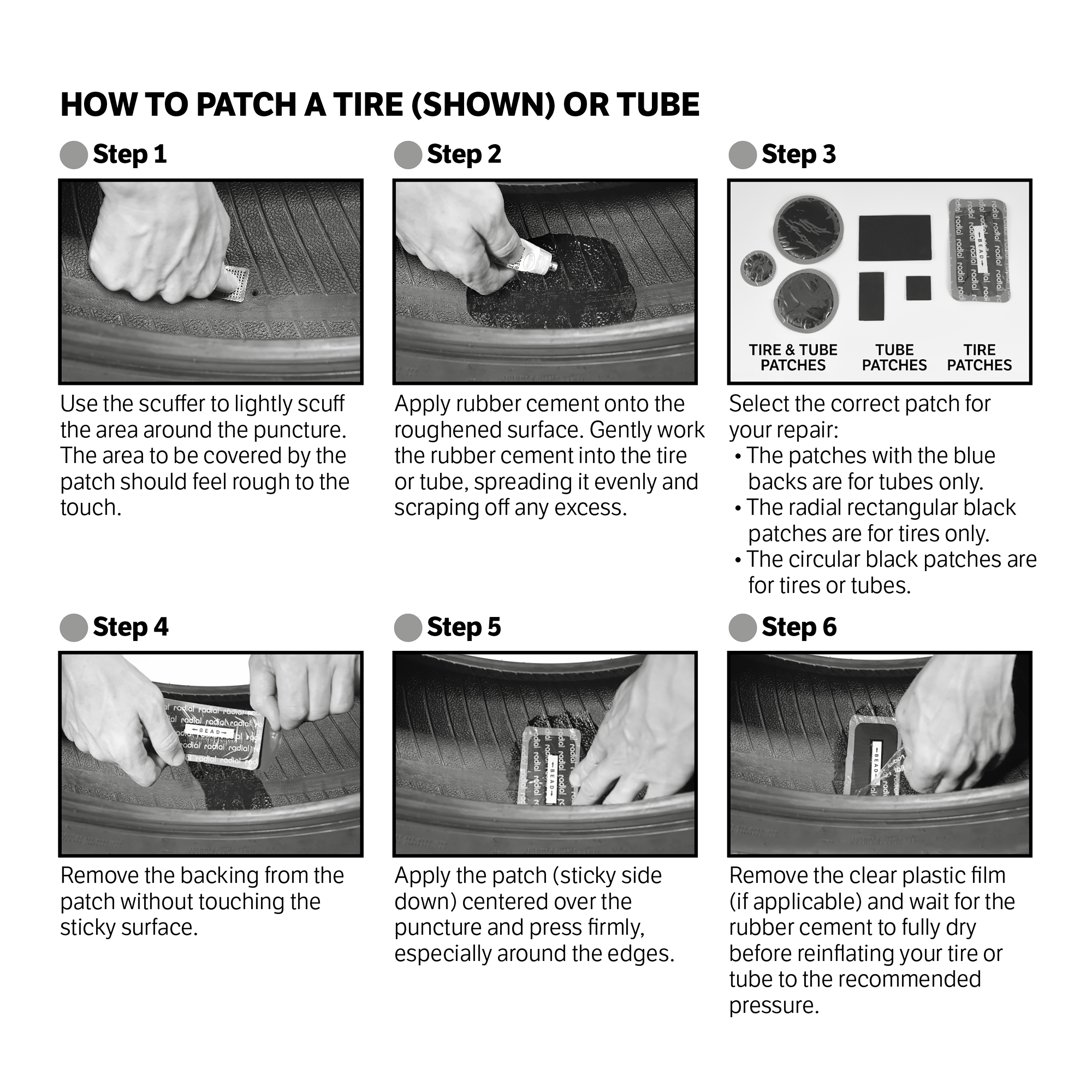 Easily repair puncture-related flats on ATVs, lawn mowers, bicycles, wheelbarrows and more. This 60-piece kit contains 2 tubes of glue, 2 metal scuffers and 56 patches (various sizes for all rubber repairs).