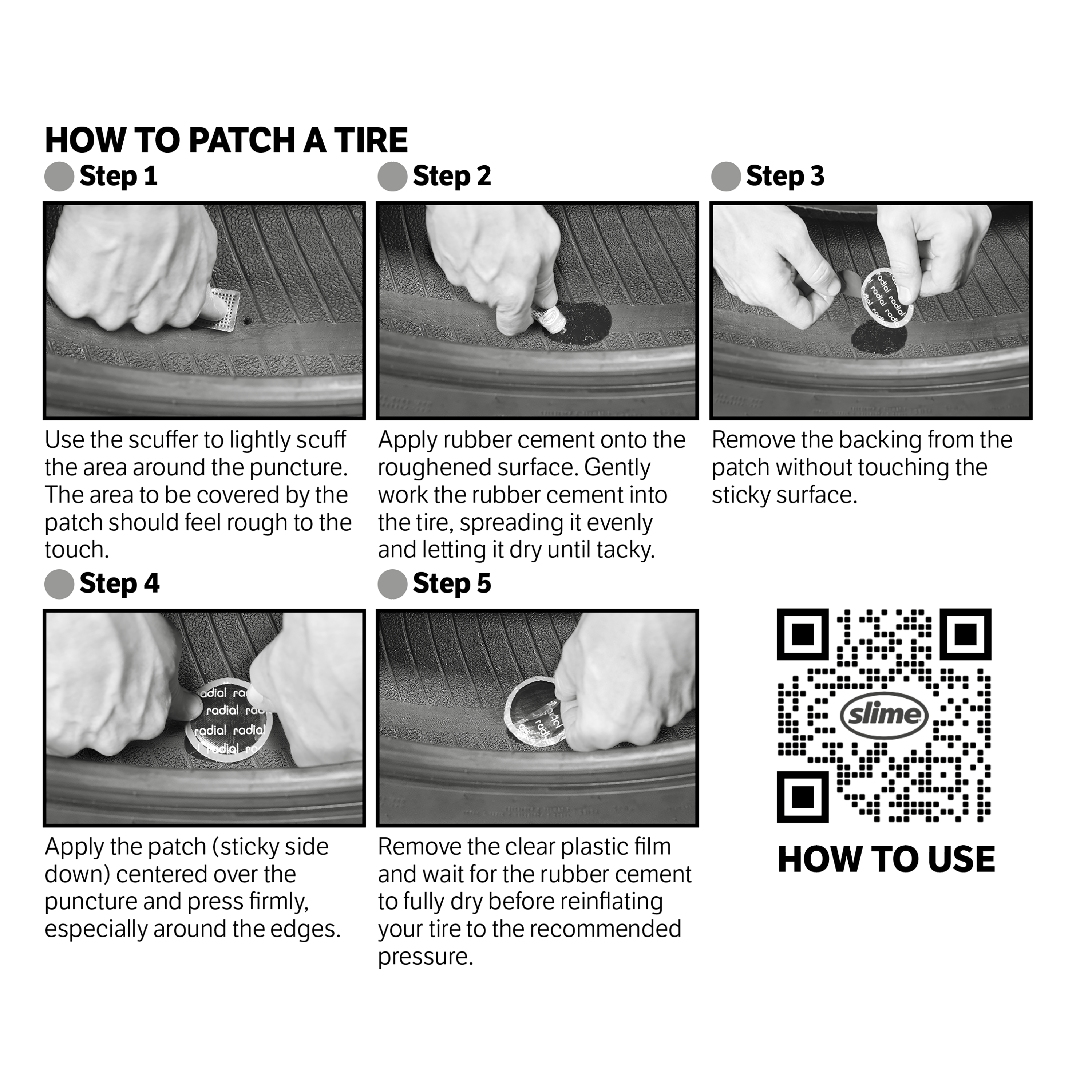 Be prepared for your next flat tire with Slime's 5-piece rubber tire patch kit. When you get a puncture, scratch up the area around the hole with the included scuffer, squeeze on some rubber cement, and apply the patch. Just like that, your tubeless flat tire found on an ATV, lawn mower, wheelbarrow and more is a thing of the past.