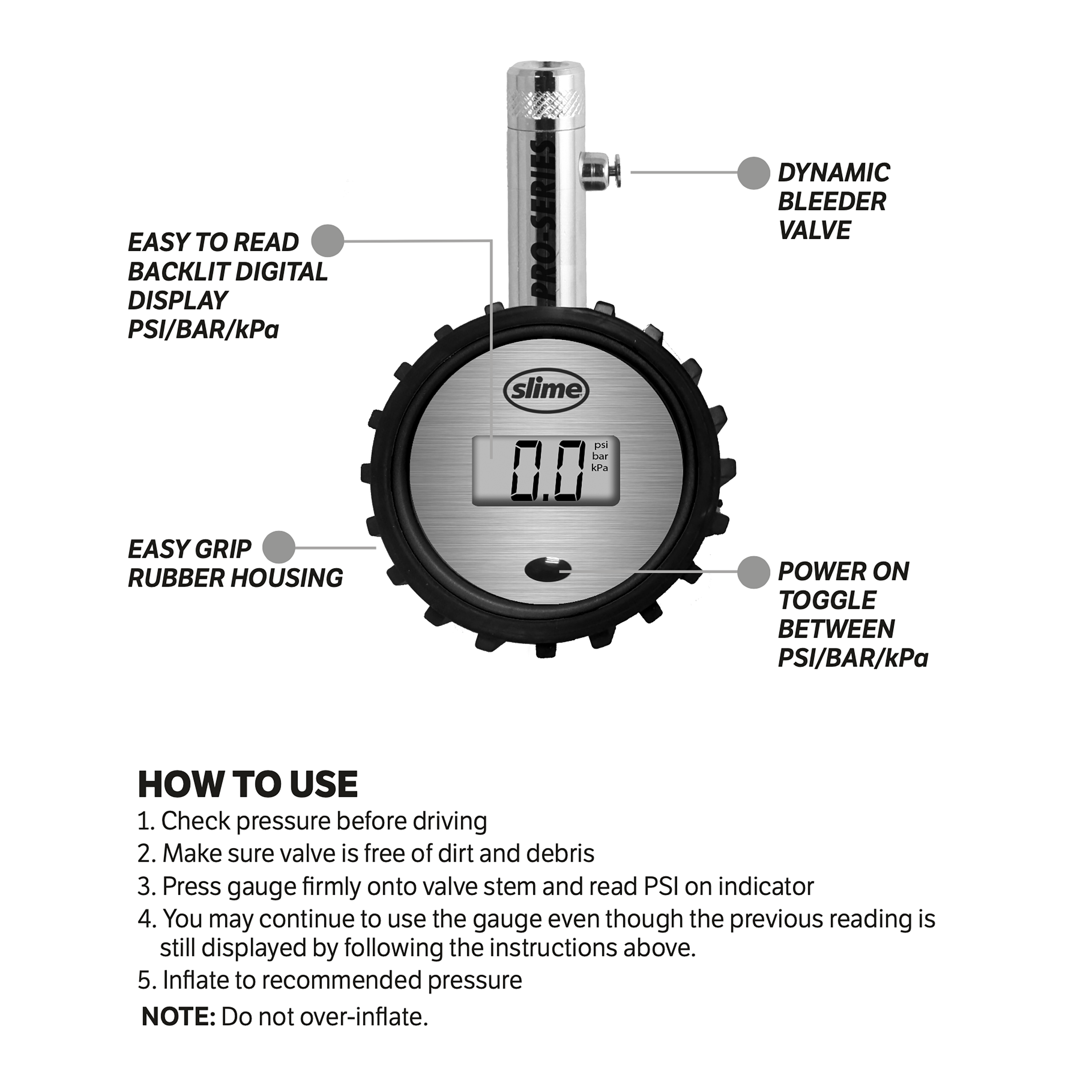 The Pro-Series Mini Digital Precision Tire Gauge helps keep your tires at optimal pressure. Built with a rugged, shock resistant rubber housing that will last, this mini gauge also features a backlit digital display and dynamic bleeder pin to take out any excess air.