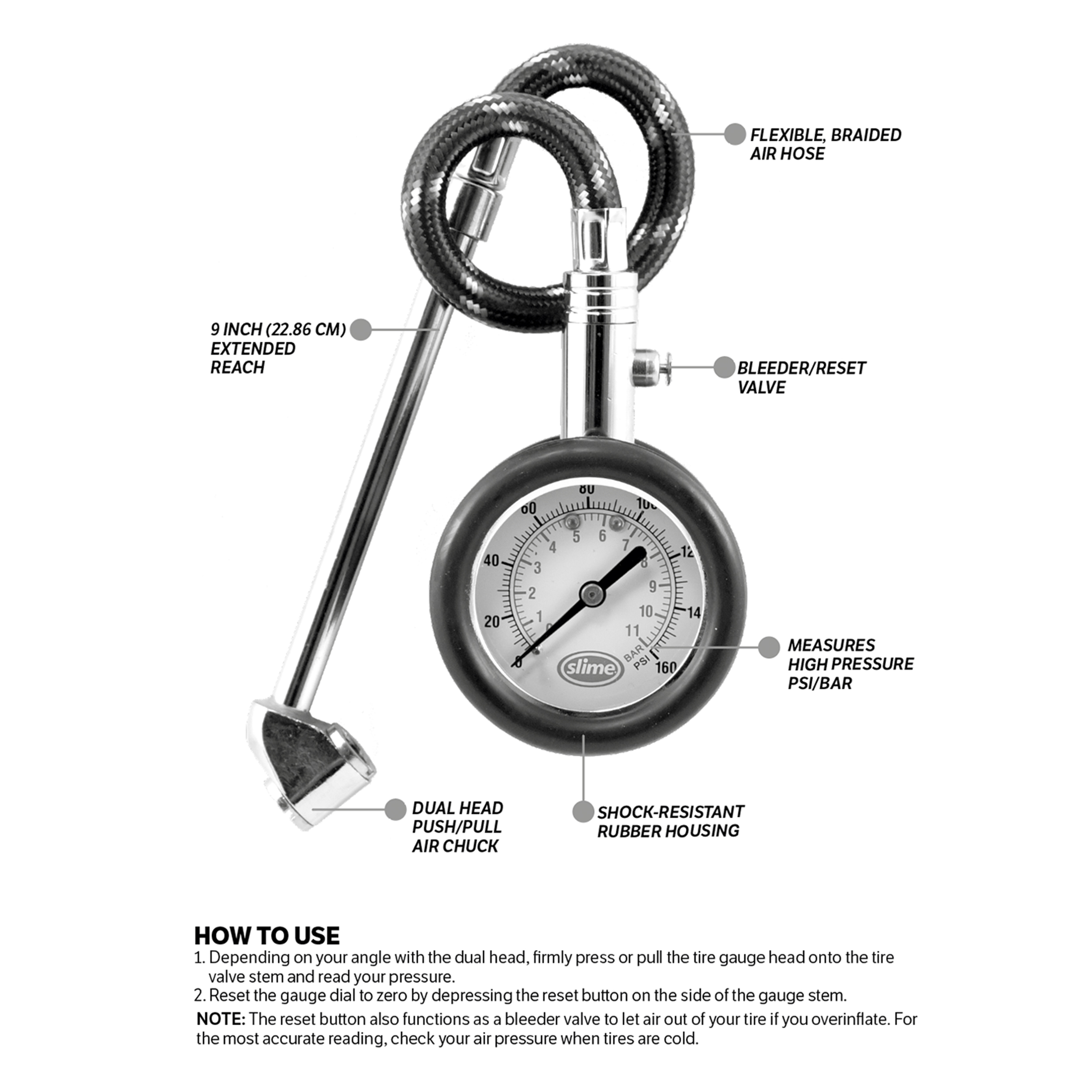 Slime's Dual Head Dial Tire Gauge features a long body and convenient, extended air hose so you can easily reach through wheel wells without hassle. With its easy-to-read dial face and shock resistant rubber housing, the Dual Head Dial Tire Gauge is great for 4x4s, SUVs, Trucks and RVs.