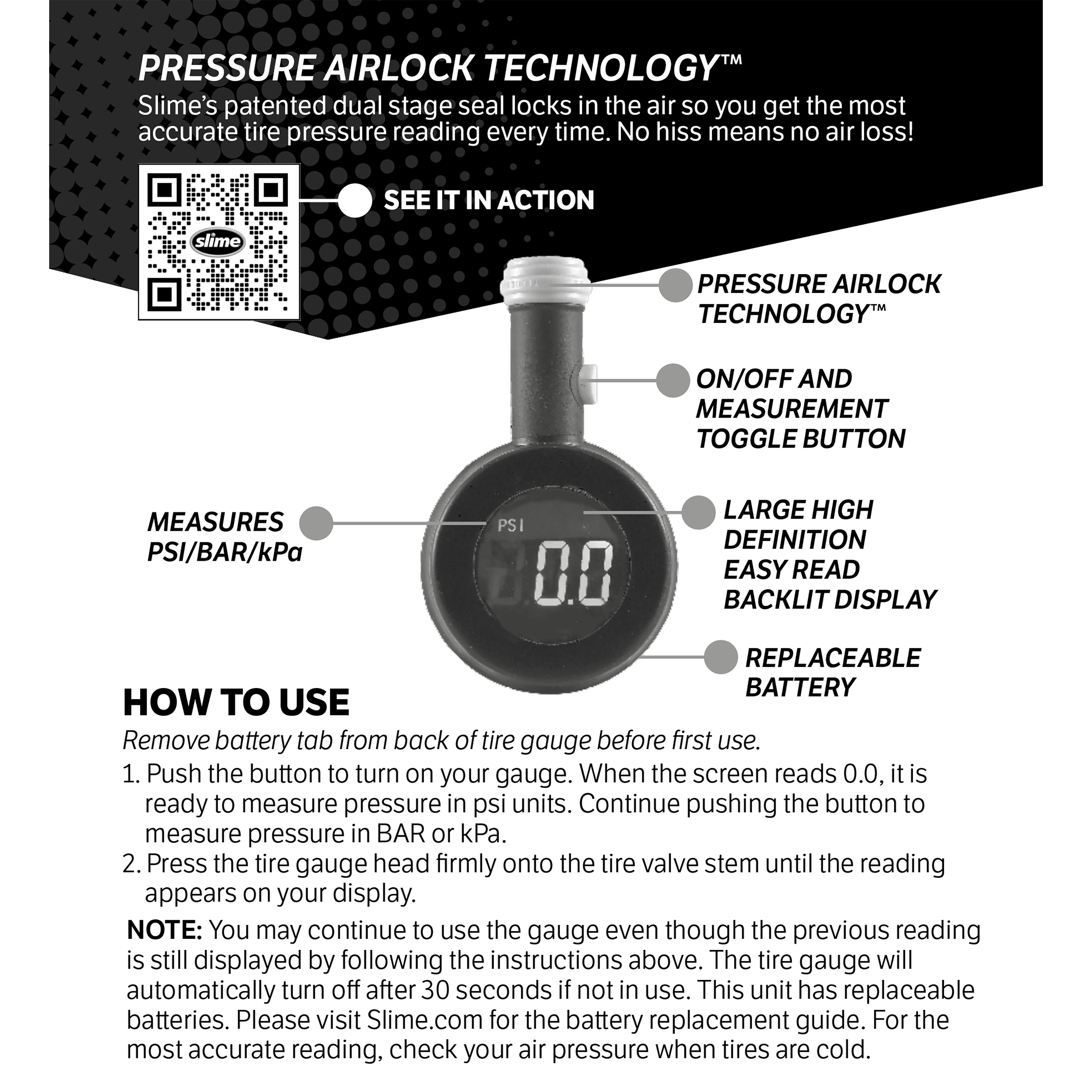 Slime's Airlock HD Tire Gauge takes air pressure innovation to the next level! Slime’s advanced Pressure Airlock Technology (P.A.T.) locks in the air, so there is ZERO air loss when checking your air pressure. Plus, the Airlock HD Tire Gauge makes it easy to see your tire pressure reading with its super big, bright high definition screen.