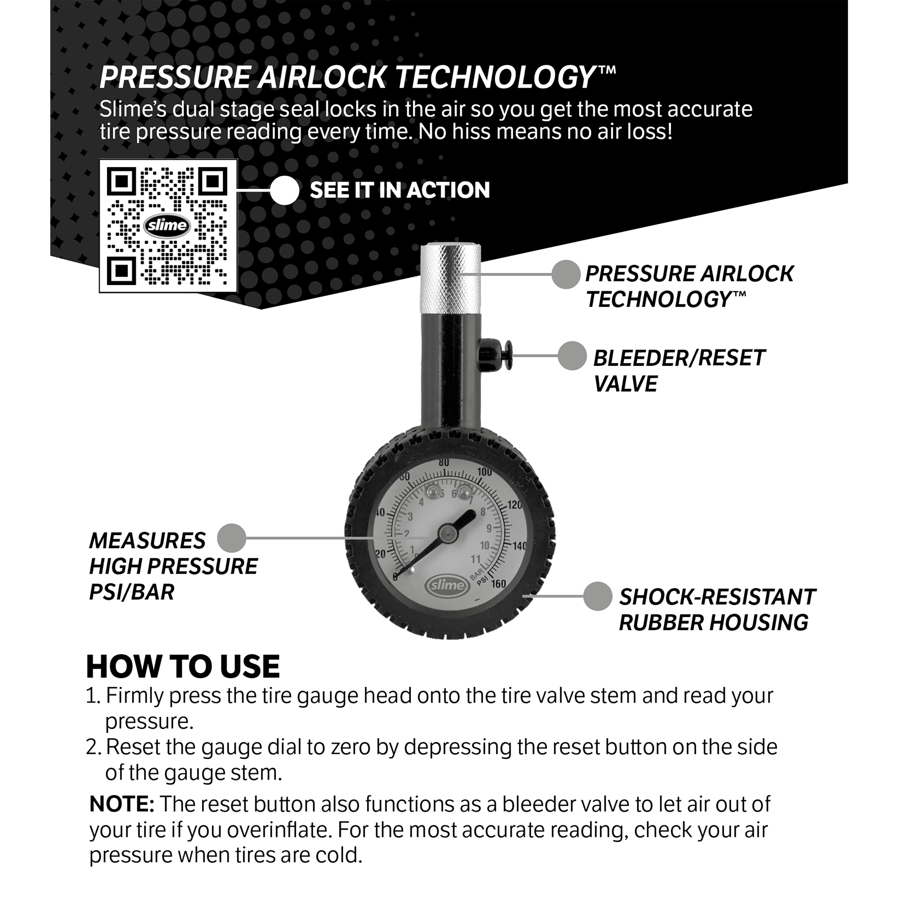 Running your tires at high pressure? Slime’s Airlock Dial High Pressure Tire Gauge is perfect for checking the tire pressure on your cars, trucks and SUVs. It offers a compact design, a rugged housing for maximized grip and a built-in reset button and bleeder valve! This tire gauge also features Slime’s innovative Pressure Airlock Technology.