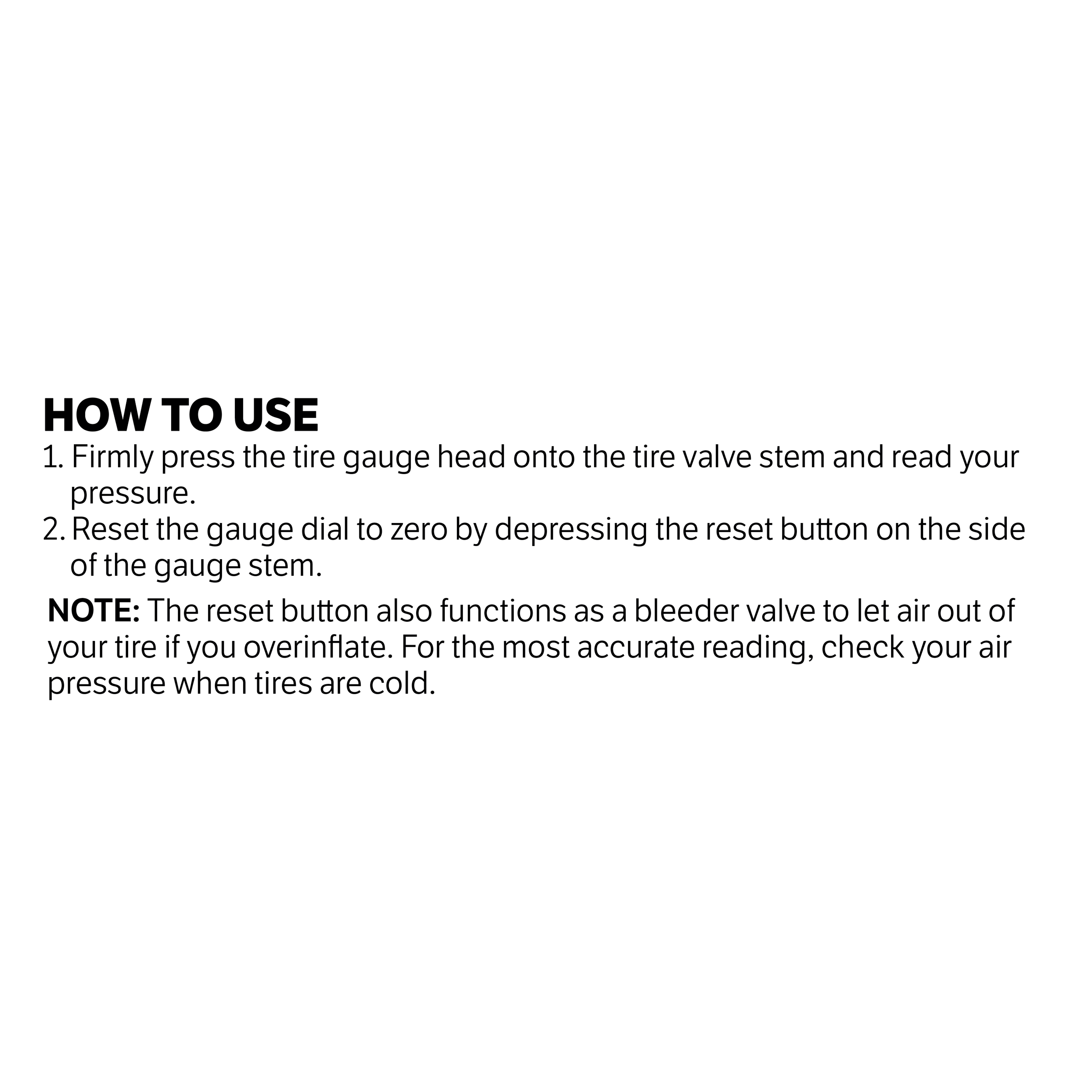 NOTE: The reset button also functions as a bleeder valve to let air out of our tire if you overinflate. For the most accurate reading, check your air pressure when tires are cold.