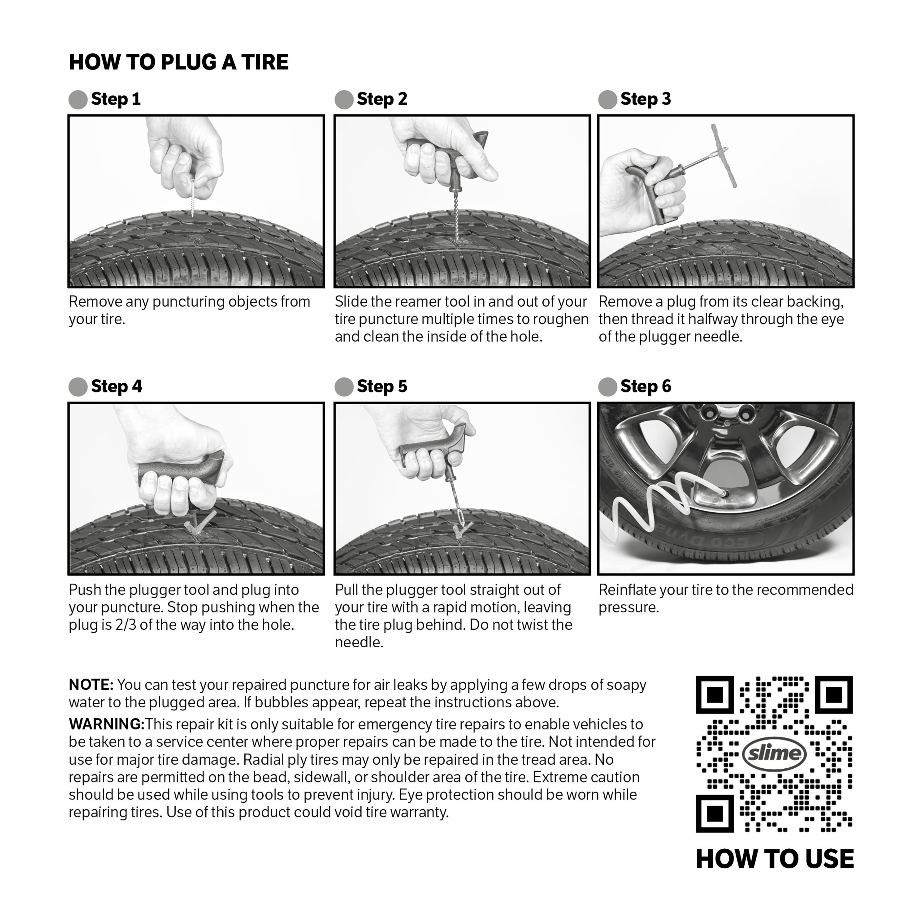 The Slime 10-piece Deluxe Tire Plug Kit includes everything you need to plug up those nasty tire punctures. Use the ergonomic, pistol-grip handle reamer and plugger tools to clean the hole and insert the heavy duty tire strings (available in two lengths!). Perfect for ATVS, wheelbarrows, lawn mowers and other tubeless off-road tires.