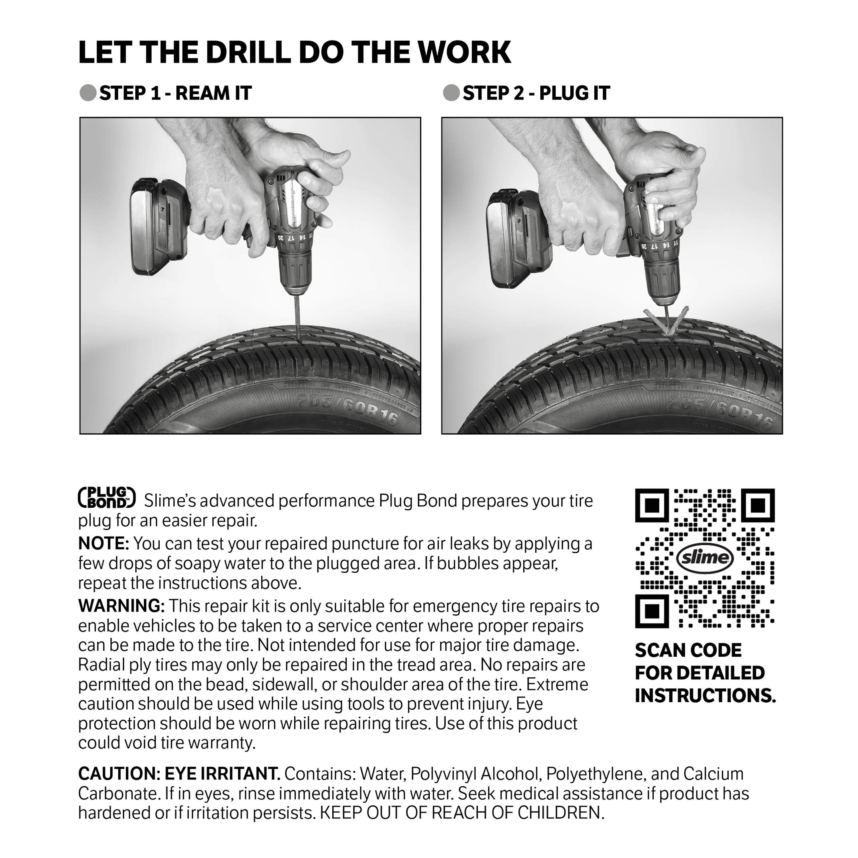 Let your drill do all the work! Slime's new Drill Bit Tire Plug Kit is the easiest tire plug solution on the market. With high-strength reamer and plugger bits that work with all drills, durable tire plugs and Plug Bond, this 9-piece set eliminates all the physical effort (i.e. hard labor!) previously required to plug a tire. The drill makes it so easy, you don't even need to remove the tire from the vehicle to make the repair. Once you try the new Slime Drill Bit Tire Plug Kit, you will never go back to repairing the old way!