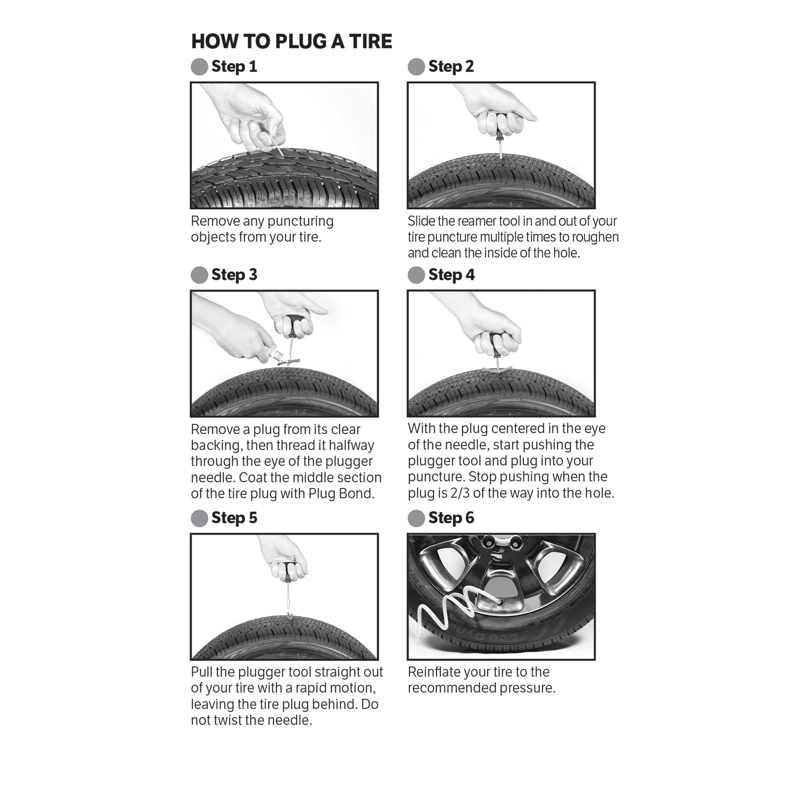 The Slime 6-piece Tire Plug Kit includes everything you need to plug up those nasty tire punctures. Use the ergonomic reamer and plugger tools to clean the hole and insert the heavy duty tire strings. Perfect for ATVS, wheelbarrows, lawn mowers and other tubeless off-road tires.